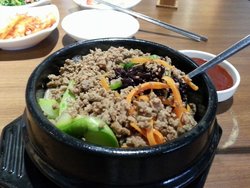 平时中午的时候生意也不错,不过不用等位。店面不是很大。烤肉店的那种环境,灯光较暗,深色的色调。每个桌子上都有烤盘。没有专门的吸烟设施,全靠空调。服务很一般,明明有WIFI,不给用。烤肉的品种很多,还有各种拌饭、韩国各种小吃。。菜式很丰富。一个人随便吃吃,点了一份迷你石锅拌饭(15元):送了四碟小菜,辣白菜、拌青菜、藕片和土豆泥。青菜好老,土豆泥较粗,辣白菜还行。送的南瓜粥非常细滑不甜腻,还不错。选的是牛肉拌饭。上面的牛肉末不少,就是有些老。饭选的是紫米,有一点硬,不过很有嚼劲。辣酱很好吃,辣中带着甜,拌饭吃好有滋味。总体感觉还可以。查看更多
