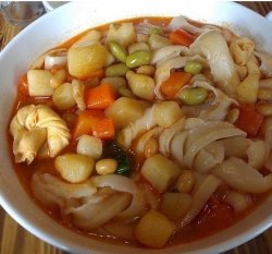 刀削炸酱面很厚,浇头是青豆黄豆肉末,味道一般,咱家一绝是脆饼+肉丝+生菜碎,不怎么好吃,油泼面够酸够辣,面条类似宽版的刀削面,而且一碗貌似只有一根,有牛肉。团购的另一个貌似是哨子面吧,有点糊的番茄汤打底,面条煮得略烂有点像乌冬又没那么爽滑。上面有一点胡萝卜毛豆碎。面得味道一般般。查看更多
