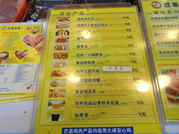 最爱这家的鸡排了,肉厚实,而且还是很嫩的,不过自从家门口的巴弟关门以后我只能到这家来解馋了最爱梅子粉 还有炸地瓜条 服务也好 心形鸡排有创意量也足足够大服务员很热心 帮我剪几块 还大包 有些我要混搭也一一做到了 环境就是连锁店的那种简洁干净式的…查看更多