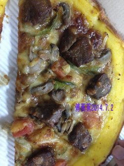 周三中午下暴雨,不能出去吃了,就和同事们一起网上订了巴贝拉,在预定的时间内准点到达,真是厉害啊。网上订餐运费是7元,但是减免了10元,等于免送货费了,不错。选了个新品意式香烤牛肉蛋挞匹萨58元,老实说个头不大,切片也都比较小,味道挺特别的,浓浓的蛋黄酱味,牛肉不是片状的,是颗粒的,好大颗的,吃起来很爽。
