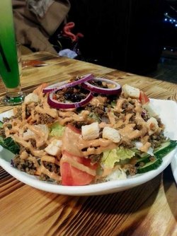 地点在金皇大厦的楼上,直接走大厅电梯,比较好找。因为是包的整层楼,所以不存在走错的可能性,看见墙上的牌匾,进来就好了。融化金枪鱼沙拉,42米,5颗星这家的金枪鱼沙拉非常好吃,这算是意外惊喜吧!而且分量很大,超乎想象的大,跟价格比起来,嗯,算是不亏吧!给这么多金枪鱼,要40块,想想也是,呵呵。。。香肠开会披萨,308米,4颗星最大的有没有,盘子端上来足有1米的感觉,简直就是摆满了那个桌子。大家兴奋的光顾给披萨饼拍照了,完全顾不上吃。等到要吃的时候才发现,我去!怎么下嘴啊!太大一角了,简直是崩溃。味道倒是一般般,薄饼的饼皮算好吃吧!费城牛排,40米,3颗星味道还不如那个香肠呢,一般!总结一下,pizza的话,一般,不是特别铭刻五内的那种。好吧,没这么严重,几乎没有啥印象,很普通。不过不知道是我去的时候人还多还是怎么着,东西半天都不上来。就一个师傅在不停的做饼,也难怪会慢啊!…查看更多