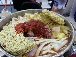 年糕李韩国年糕料理在部队火锅里面算是做的比较精致有诚意的,所以到饭点就要排队啊排队!排的心塞啊!因为别家的部队火锅是在后厨加工成半成品上桌,这家是生的上桌煮,所以时间特别长。浓浓的芝士搭配上农心拉面,再配上辣白菜的底料,确实别有风味。查看更多