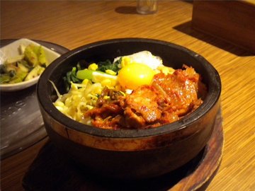 点单就送4样小菜,吃完还能再要,这点最喜欢了。蜜汁土豆,土豆很糯,甜甜的酱汁超好吃南瓜粥。蓉般质地,口感顺滑,南瓜香味浓郁,好喝海带丝和芹菜,这2个无感泡菜五花肉石锅拌饭,28米喜欢里面那个生鸡蛋,趁热把鸡蛋搅匀到饭里,和锅底的锅巴一起搅开,这样鸡蛋就能很快烫熟了。里面的泡菜很入味,口感爽脆,酸度适中,配上大块的五花肉,和美味的拌饭酱,真的不错~…查看更多