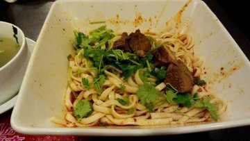 今天的中午饭,这家店店面不是很大,但是干净利落,环境不错,里面布置的很是温馨,服务员热情周到。 推荐他家的牛肉拌面 牛肉拌面,说实话,感觉量有点小,一共4块牛肉,不过味道不错,面很是劲道,很有弹性,弹性十足, 牛肉虽然量小,但是很是入味,一点也不柴。 汤也是老汤,很是好喝,因为我个人口淡,所以感觉有点咸。 价位还算可以。