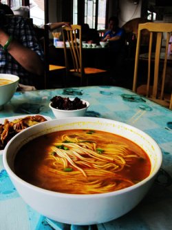 这家店没有什么门面,底层只够放一张收银桌,吃面的各位必须爬个楼梯,但是别因为这个小看它家,美食达人是不会放过这里的好味道的。他家的招牌就是热腾腾的羊肉面,面汤是羊棒骨熬成的,吃得出是把里面的骨头熬透了的原汁原味、滴水不掺,面吸饱了汤水,羊肉的鲜渗透进面里,味道实在太赞了。还喜欢这里的羊杂汤,放足了料,羊肺、羊肚、羊肠、羊头肉,真实在,冬天点上一碗,让你吃的大汗淋漓,大呼过瘾!很多老客人都会在早上来这里,点上碗羊杂汤配上葱油面,这种组合也只有这边最正宗了,而且他家还供应夜宵哟,喜欢吃夜宵的朋友们不要错过。…查看更多
