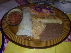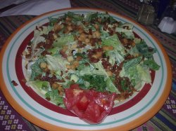 姐姐生日到啦,我就在网上搜索了西餐,本来其实想去吃牛排的,我也没注意他们家原来是墨西哥风味,看到说生日有打折就很兴奋的来了~~~这里进来有好多家饭店,都是什么希腊风味的,印度的等等。他们家的门面还不错,进去之后发现里面的环境也很好,感觉很温馨~~~非常喜欢~~@色拉,我们没有加什么金枪鱼或者鸡肉,里面就是些素菜,生菜,番茄什么的,还有面包好象。味道不错,主要是色拉酱我挺喜欢的,是那种酸酸甜甜的,量很大。。最后都没有吃完。。。@烤薯皮,噢噢噢非常好吃,它外面那层土豆烤得很脆,里面还有肉啊什么的,所以咬下去的时候先是脆脆后来又是软软的,再沾了点酱(那个是什么酱呢。。。感觉有点像酸奶)。这个东西非常管饱,吃了两三个就有点不行了~~~@德州肉卷,我怎么记得菜单上应该叫墨西哥肉卷呢,说到菜单,我得提一句,菜单都没有照片,只有中文+英文。。。不好不好。这个肉卷的量也很大啊。。。吃上去好香,外面还有点饭+咖喱。两个大肉卷最后还剩下了1/4,浪费了浪费了~~@蓝莓雪葩,就是蓝莓冰沙,姐姐说的~~~味道不错,就是小贵,这个饮料还不能算打折@牛油果奶昔,我一直怕奶昔太甜,这个还算行,甜么是肯定的,不过牛油果感觉比较清爽,量也很大。。。最后最起码剩了一半。。。这个还大贵。。。下次不点了。。。他们家我还是很喜欢的~~~我还想来吃,想吃那个九层塔,还有法嗨塔,不知道下次是什么时候了~~~下次不点饮料了,这样可以便宜很多吧~~~查看更多