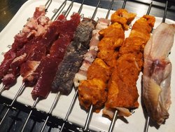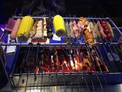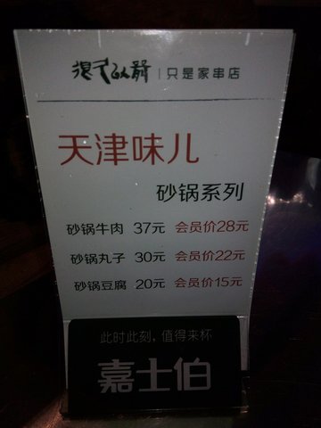 那天抽中了【天天中奖】活动中的“很久以前只是家串店”的百元代金券。欣喜之余约了闺蜜一起前往!日出到日落的营业时间很有噱头,中午不营业,从下午5点开始开门做生意。装修很特别,整个店设计的跟史前时代的山洞一样,即便是大白天,里面都黑洞洞的,到处写着:xxx年以前,楼梯处的墙壁上,用LED荧光灯弄的猿人进化成人的过程。一上到二楼一个硕大的,用灯带照射的LOGO。我觉得二楼设计的比一楼有气氛,有点进了夜店的感觉!尤其是楼梯右手边的卫生间和洗手池,头开始上楼参观我都没发现那边是干什么的,后来上楼找厕所才知道原来那些的用途!但光线实在是太暗了,拍照也照不出效果,就没回去拿手机拍照!二路靠墙有一排包间,很有点车厢的感觉!这里的服务员各个都很有活力,每当有客人进店,全场的服务员都要大声地招呼:欢迎光临一类的词!不管是负责哪桌的服务员,只要经过你桌前,就会帮你看一眼你炭火上的烤的串。只要你有需要,她们会马上微笑着为你服务,几乎可以称的上是有求必应的那种!而且那笑容决不是那种皮笑肉不笑的假笑,而是那种很有感染力的笑容!而且点餐时会有服务员会主动提示你,加微信可以享受他家的会员价,为我们省了一部分餐费。自己动手的烧烤店也吃过很多家了,一般调料或腌制肉方面都会下心思,但他家就稍显逊色,味道方面真的很一般,价位也挺高,连木炭料包都按人头算钱。空调冷气不足,守着炭火实在是各种热啊!那天可能到的也有点早,以至于啤酒完全不够冰。最后就是服务热情必然是好事,但每当有客人进店,就全场服务员大声呼喝,实在是导致整体环境嘈杂的很,乱的很!和对桌说话必须喊着说,还经常被全场忽然一嗓子的呼喝给吓一跳!或许适合年青人聚会,但是个人受不了这种吵杂的环境,感觉整个脑子都嗡嗡的!晚上十点以后进店,女士送一瓶啤酒!经典百威啤酒(¥9.00):要的冰的,结果服务员拿来一瓶问我这个温度行吗,这时我们已经守着热碳坐了一会了,我一摸就皱着眉头和服务员说,这不就是常温的吗。她又去换了一瓶,回来继续问我,好歹比刚才摸着凉了点,我问她还有更凉点的吗,她说没了!我们也只好将就了! 开始时我光顾着和闺蜜聊天,也没摸清那个烤炉的窍门,不小心把个面包片给烤糊了,服务员发现马上过来给拿上面去了,并指导我们如何将齿轮对准链条,可能是被大堂经理发现了吧,过来跟这个服务员说了几句,没多久端来两杯水果沙拉,说是赔偿我们烤坏的面包片的!我和闺蜜两人面面相觑,她小声跟我嘀咕,这个水果沙拉多少钱一杯?我说我只知道面包片1.70一片。一会加串的时候她特意看了下水果沙拉的价钱,一副赚到了的模样告诉我18一份!话说,还多亏了这水果沙拉了,它比啤酒可凉快多了!全靠它给我两降温了!里面内容很丰富:西瓜、苹果、哈密瓜,还撒了很多甜甜地葡萄干!这种烧烤形式比较新颖,自己动手烤还不用翻来翻去的,这个机器也算是比较有创意。而且自助式烤炉很方便,卫生,肉串也很好烤熟。果然是面包片比较好吃,蚕蛹还是没能让满意,大家推荐的鸡翅也不觉得好吃!烤玉米很香很有艮劲儿!服务员看我们点了烤鸡胗,向我们推荐烤鸡心,我们没点。烤扇贝(¥10.00/会员价)和生蚝(¥10.00/会员价)由工作人员烤好给你端来,我向来特别爱吃蒜蓉粉丝扇贝,所以每人要了两个烤扇贝和一个烤生蚝。砂锅豆腐(¥15.00/会员价)吃烤串必配砂锅豆腐,醋椒的口味,酸甜开胃!…查看更多