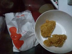人真是不多,门口广告写着套餐15元起,看见有人点完套餐说怎么18啊,服务员说写的是15元起。我是参加他家微信活动抢兑的一元鸡翅,去兑换还是比较顺利,服务员很客气,但是点完付完钱才开始炸鸡翅,足足等了一刻钟吧。真不像快餐店啊。他家鸡翅只有香辣鸡翅,也确实很辣,但感觉外皮有些发干,口感确实不如M和K家啊。