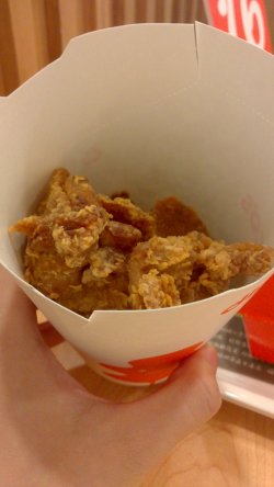 周末去的,里面吃的人还是蛮多的。跟肯德基类似的炸鸡快餐店,买了儿童餐厅,6块鸡块+1包薯条+1杯橙汁,一共19元。还送了1个玩具。他家的鸡块炸的很脆的,外皮有点咸咸的,里面的鸡肉很嫩的。薯条也就一般。手枪腿本来想买的,太贵了,1只要19元。查看更多