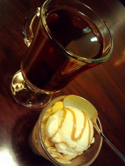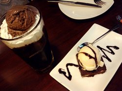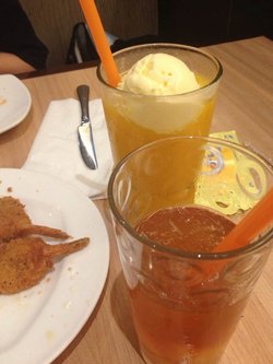 和好久没见面的曾经的同事约在这里见面,约的时间是3点,刚好赶上下午茶的时间,也是他家相对最实惠的餐品,因为饮品可以免费续杯,对此,我们两个鸡贼的穷鬼表示非常开心。同事请客,我点了最便宜的29元A套餐,朋友点的30多的C套餐,因为姐们儿到了下午3点还没吃饭,所以又加了个小吃拼盘。我点的饮品是洛神花茶,大大的玻璃杯里盛着热热的花果茶,红红的很好看。其实我自己也经常买洛神花沏着喝,很喜欢那种酸酸的味道,不过他家的洛神花茶却比较甜,可能这样的口味更容易被接受吧。小吃点了一份布丁,布丁大概占了半个杯子的分量,浅黄色的布丁比较香甜滑爽,上面有一些麦片和一个冰淇凌球,冰淇淋凉凉甜甜,麦片香甜酥脆,多种不同口感和口味的食材累加在一起,倒也非常和谐。朋友点的饮品名字我没记住,类似雪顶咖啡的意思,下面是加了不少冰块的可乐,冰块能确保液体上面的部分有足够的浮力能待在最上方,冰块上是一层厚厚的奶油,这样既增加了浓香的口感,又丰富了观感,一个冰淇凌球稳稳地坐在顶上。他家的冰淇凌味道还可以,但口感不细腻,一般水平吧。布朗尼,摆盘挺好看的,只是小小的一块点心非常容易就被上面的大冰淇凌球喧宾夺主了。冰淇凌不多赘述了,布朗尼比较一般,应该不是现做的,外皮比较硬可以理解,但里面也没有绵软的口感,能吃出巧克力的味道,但不香,坚果仁不少。小吃拼盘里有薯格、鱿鱼圈、虾球和鸡翅四种食品,都是炸制食品,闻起来倒是挺香的,不过太油,搭配的是蛋黄酱,真是够重口味的。聊的时间比较久,中间续过一次杯,让我感觉很好的是,续杯的饮品并不是往之前使用的杯子直接续,而是另拿一杯全新的,包括上面的冰淇凌。因为店里比较凉,朋友喝冷饮喝得直起鸡皮疙瘩,于是要求跟我换续杯饮品。我们是工作日到店的,整个就餐时间中人都比较少,就餐环境还挺舒服的。查看更多