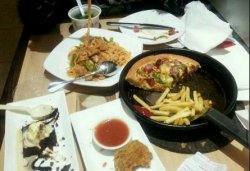 必胜客欢乐餐厅 西城区西单北大街109号 大过年的也慰劳一下自己,要了个面,不是很好吃,也许是吃不过那个味道吧,酸不酸,咸不咸,甜不甜的,哈哈是不是有点像山炮呀……第一次吃不是很懂,也怕吃不惯,还偷偷的从肯德基买了点别的带来了,呵呵……不过批萨的味道不错,很松软,不咸不淡很好吃,价格也不贵,以后争取多来几次查看更多