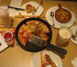 晚餐的时候来的,人比较多,点了一个海鲜的比萨和两杯奶茶,还要了几个鸡翅,味道都还不错,比萨很好吃,海鲜味也挺浓的,上面还有几个大的凤尾虾呢,很诱人哦,这里的环境很不错,灯光很美,坐在靠窗户的位置吃的,很享受哦