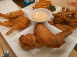 【人气拼盘】43元,来必胜客不得不点的人气小食呀!!人气拼盘之【中对翅】是我大爱,谁叫我最爱鸡翅呢?!而且就跟新奥尔良烤翅一个味道,甜甜的酱料均匀地涂于鸡翅表面,刚咬下去焦焦的,甚至听到油在嘴边溢出的声音,吃进去却是一点也不腻,甜中带辣,辣中有留香,赞!人气拼盘之【鱿鱼圈】也很给力,鱿鱼QQ的,相当有嚼劲,外面覆盖的一层面不薄也不厚,略带咸味,给鱿鱼加分了~人气拼盘之【凤尾虾】只有三个,虾虾炸的很嫩,鲜鲜的,脆脆的,齿间留香,吃的出来炸的火候还有力度~人气拼盘之【薯饼】是四个中个人觉得最差的一个,但是也还不错,就是有点涩,可能是土豆没有选好的缘故吧~查看更多