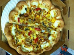 哎哎。。正值半价时期。。可惜那天去的时候正好是六一儿童节的第二天。。人哈多。。么次成。打包了个明星产品披萨。。原价额。。新奥尔良风情烤肉披萨。。大份的。加了芝心ohno!!好难次。。硬邦邦的感觉。。有番茄。鸡肉。蘑菇洋葱。当然鸡肉的量最少。好吧。我第一次次他家的芝心。以前次过不加额。也不好次。。木有拉丝。。不过他家的小食。饮料还好。。蛮好次额。