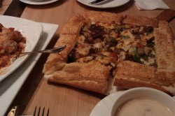 现在出门都是上馆子滴~什么约同学麦当劳必胜客聚聚会吓死人的。可是就是这样吃不到但广告天天诱人的放。。。。个么就去吧。圣诞后的新品起酥芝心小牛排披萨那个广告里真的是那个诱人啊~诱惑死我了。所以这个必点 乃么一上来就先期待降一半,广告里抛的高高松松的,其实扁踏踏,说说吃起来哦,真心像早上吃的中式大饼。。。。。挺干的。恰巧的是我那天早上还真吃的大饼油条,说给同学挺都笑死了。当然也没这么烂啦,我还是客气点比较的好。…查看更多