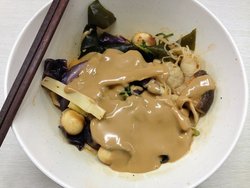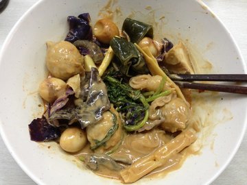 不起眼的一家麻辣烫小店,进去之后一股麻辣烫的味道就扑鼻而来。小店虽不大人却不少,大家都拿着篮子选自己爱吃的蔬菜牛肉丸鱼丸等等,然后交给柜台算账,之后就是坐等叫号取麻辣烫啦。底汤是微辣的,自己还能接受,因为不是很能吃辣,出锅之后的麻辣烫可以随意加蒜汁儿、麻酱和辣椒,我只要了麻酱,服务员给的真不少,满满的一层。搅拌之后,尝了下味道真不错,稍稍有点偏咸,又要了瓶北冰洋。热饮还有露露和椰汁。吃完之后,浑身热乎乎的,很舒服。