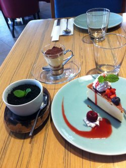 悦澜湾在蓝色港湾,开的时间也不长,装修的非常舒服,层高很高没有压抑感,可惜上次去忘了拍环境照他家的甜品做的都很精致漂亮,味道也都很不错如果没有单点饮品,服务员会奉上冰水【盆栽蛋糕】最近盆栽蛋糕是大势啊,很多甜品店都推出盆栽,并且很受欢迎。用奥利奥磨成粉作为盆栽的土壤,下面是好吃的奶油和蛋糕,感觉很美好【提拉米苏】口感很细腻,味道也是很不错滴【芝士蛋糕】一向爱吃芝士的我反而觉得这个芝士蛋糕在另外两种蛋糕面前有点逊色了,芝士倒是细腻绵密还满浓郁的,但是不如两外两种好看,淋了草莓酱我不太喜欢,而且草莓过季了本身不太甜查看更多