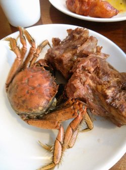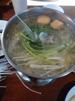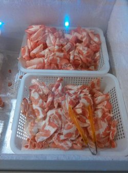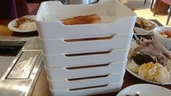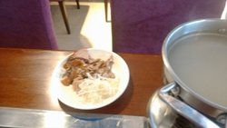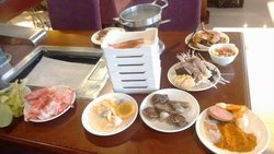 门脸不大,就一个门面,上楼之后就别有洞天了,里面非常之大啊,收银台在门口,溜进去是不可能的啦,人多的时候有人看着,凭票进入的,就餐前每人10块钱押金,时间2个半小时,其实吃的东西不怎么多,分类摆放好的,有的区域名不符其实的,上面一个灯笼写着铁板烧,摆着的却是东北一锅炖……服务员在场子里穿来穿去的,好像很忙的样子,可是不怎么管事儿,有的客人不知道涮锅用的用具在哪里,想让服务员帮忙拿一下,就给人只是指个方向,让人家自己拿,有桌个人非要让服务员给拿,服务员老大不乐意的,嘀嘀咕咕说什么【来吃自助还得让我伺候】……一般来说,你摆好涮锅用的支架,锅之后,能去找服务员让她给你加水,弄酒精灯什么的……他家的涮锅种类不算多,肉什么的很碎,羊肉有点肥有点膻,菜倒是还不错,基本几种常见的菜,也比较干净烤肉的话,类别也不是很多,大概7,8种的样子吧,不过他家的肉基本上都是煨过的肉,味道还是很浓郁的,可能是煨的太厉害了,烤两片肉就得换纸,换纸得找服务员,害得我都不好意思了,一个大厅的人都在叫服务员换纸,关键吧,那个炉子整的脏乎乎,边上全是煨肉的料汁,“结痂”了都,服务员视而不见,不给清洗不给换桌海鲜的话,虽然都是在水里泡着,但是感觉都已经死掉了,各种蚬子,有时有鱼肉段,有时有片鱼,有鱿鱼哦~凉菜的种类还是比较多,中华海藻味道不错,哏啾啾的,还有鱼皮,有点辣,皮冻什么的烤鸭的话一份比较少,不过挺腻的,生鱼片不知道是什么鱼,软软的,还没有辣根蘸料的话,感觉上基本上都是火锅料,麻酱什么的,烤肉料就只有一个干料,有点辣辣的也提供虾和螃蟹,螃蟹是河蟹,限量的,一次就给两个螃蟹,螃蟹有黄呢,不过外皮脏乎乎的,钳子那里还有一堆泥巴呢……虾一次就给5,6个,个头也不大,是冻过的,生蚝个头不大,烤完之后就什么都看不到,全是粉丝那种东西盖着呢上次去,还看到大骨头了,太不地道了,吃着没有骨头香味儿,反而觉得好腻啊…查看更多