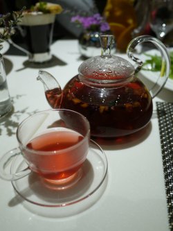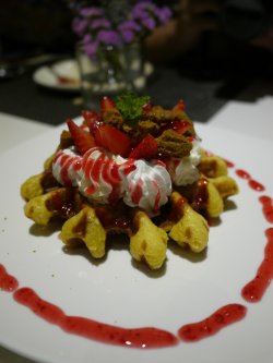 这家餐厅绝对是环境和服务要胜过美食和价格,因为西餐总是 环境,价格肯定是贵的,尤其是法国菜,讲究的是卖相和小资。这家店没什么人,主要是在网上没什么名气,要是经过微博和威信的宣传,绝对第二天的食客就络绎不绝了。西餐厅环境是真心嗲,各种花卉,各种植物,各种酒,各种宽敞,沙发椅都是丝绒的,表太舒服哈。这么有意境的地方,喝下午茶是极好的,其实关键是木有钱吃正餐。草莓卡仕达脆饼,香蕉巧克力松饼和锡兰红茶,这样人均就六十多了,穷人吃不起。松饼和外面的甜点店差不多,比较一般。脆饼推荐的,长得很好看,上面是新鲜的草莓,奶油和巧克力,底下是脆饼,和华夫饼类似,口感蛮脆的。