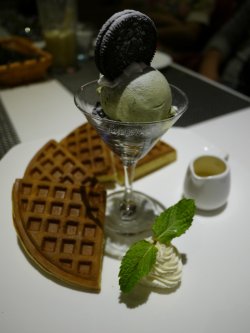 法国餐厅一直给我一种很高档的感觉,所以当小伙伴们准备一起去这家店吃甜品的时候我有点犹豫了,这是屌丝的行为么。。。不过有这么多人陪我怕什么,再说吃不起正餐吃甜品又不犯法咯,果断走起。餐厅环境哈嗲,暗暗的灯光,每桌上都有不同的花卉,沙发座还是那种绒的,很有情调的感觉,其实适合情侣,我们这群小伙伴太扎眼了。我们是看好了各种甜品来的,草莓卡仕达脆饼、香蕉巧克力脆饼、草莓香妃松饼、抹茶冰激凌、起司蛋糕、提拉米苏咖啡、拿铁、红茶、蜂蜜柠檬冰茶,其实本来还看中他们家下午茶套餐的,不过看着点了太多了。满满一桌子的甜点和饮料,卖相最佳的就是草莓卡仕达脆饼,外貌协会绝对爱,底层是脆饼,中间是满满的卡仕达酱和奶油,上层是草莓和可可粉,大概差不多一半都是我吃掉的,绝对不腻哦,草莓清香新鲜。反正其他甜点也是不错的啦,最后大家基本上都消灭了。