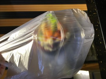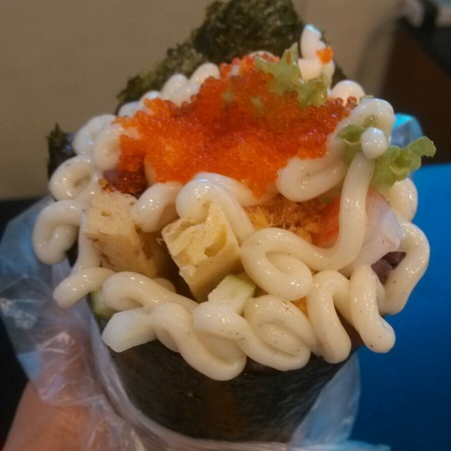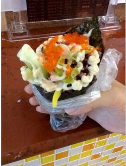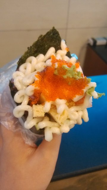 地方有点难找,绕来绕去地找了2圈。环境很干净,被店员热情地接待了呢。要了两个黑米卷打包,不一会儿就做好了,还提醒我要快点吃掉。食材很新鲜,吃起来也健康,里面有很脆脆的黄瓜,水淋淋的生菜,上面的蟹籽有点甜甜的。下面米饭是酱汁做的,我还是喜欢日式醋米饭那种做法。。不过整体吃下来感觉挺不错的。