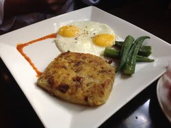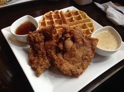看到奶奶和嫂子都对他们家的炸鸡华夫饼都赞不绝口,决定一试。环境:LOGO的那只猫十分霸气,十足的BOXING。门口招牌特意做旧,有一种朋克酒吧范~店内比较昏暗,晚上过来喝一杯再合适不过,LG坐定后就冒出这种想法,查过啤酒价格真心不贵。我们到得早,被安排在二楼靠窗的小桌,厕所的门很重,娃们很吃力得才能推开,厕所的墙壁很个性得在水泥中镶嵌着各个品牌的啤酒瓶盖,很漂亮!最喜欢的还是他们家的黑色皮沙发,舒服!整顿饭下来,发现光顾的客人都是有订位的,生意不错。服务:招呼我们的是几个二三十岁的女生,没有统一着装,说话有点大声,稍许和他们家的环境有些不搭~态度还算不错。点单:《Toast Bread》免费先赠送了一切为二的一片吐司,烤得略焦,的确松软,不过没有勾人之处。《Short Rib Hash》85元我们点了两个有推荐标志的brunch。LG的brunch通常只会选牛排,看到这款是牛肉就点了~上来一看金黄的饼,挺厚实,考拉一下子有些捉摸不透,不是牛排吗?原来是土豆加洋葱家牛肉丝活在一块煎成饼,就是一块大气点的土豆饼...味道还行,牛肉丝给得有点可怜,都没见着两根~考拉没好意思多吃,尝了一根,牛肉不错,土豆泥偏湿了些。配菜是两个太阳蛋和四根秋葵,太阳蛋煎得恰到其份,很美味;秋葵洒了小小盐粒嫩烤,入口粘滑,好吃!《Chicken & Waffles》90元这款就是奶奶和嫂子大赞的brunch了,好大量啊~真怀疑她们是怎么吃下去的...一大圆盘华夫可分四小块,这是考拉在上海吃到唯一值得称赞的华夫饼,网格做得很漂亮,上桌保持该有的热度,外脆里绵,有蛋糕的口感,完全不干不粘喉,蛋香味浓郁,沾着枫糖吃很完美,考拉竟然吃下去了一半,给了LG四分之一,带了四分之一回家给老爸尝尝。炸鸡配了千岛湖酱,个人觉得有些小小炸过了,虽说腌制得不错,但鸡皮炸得过干,鸡肉外层过硬,只能给个中评吧~《Brunch Americano》套餐+15元加十五元组合个套餐就可以有咖啡或红茶或果汁了,LG想和的espresso不在选择范围,无奈退而求其次得来了杯美式,咖啡极苦,品质一般吧~《Orange Juice》套餐+15元考拉选了橙汁,首先肯定不是鲜榨的,喝不出是那个牌子,口感偏酸。像这种阳光明媚的早晨,其实坐在室外会比较舒服,不过他们家的室外座位就坐沿街,如果有个院子就好了!…查看更多