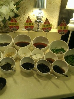 位于蓝色港湾儿童城地下一层,有一个食美汇美食广场,挺醒目的。下午4点半到的,里面已经有些人了,三三两两的。锅底有麻辣,原位,咖喱,番茄可以选一,选了麻辣,后来证明这个太辣了!!套餐是39一个人(包含锅底),牛肉,羊肉,大虾选一盘,不能再加。剩下的就是回转在台子上的自选了,青菜,鱼丸什么的。小料自助,麻将太闲不太好吃。