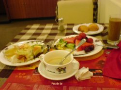 他说主要以点单自助为主的。价格还算适中的,环境也不错。焦糖布丁,这个甜品,每桌都有,甜甜的焦糖配上滑滑的布丁。美味。罗宋汤,好喝,里面的东西很丰富的。蓝莓慕斯,喜欢吃慕斯,蓝莓口味的就一般。他说的牛排味道一般。查看更多