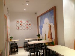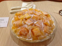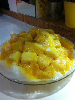 店面还不错,较为清新淡雅的色调,白色和橙色为主。不算大,但我估计应该比厦门的大吧。有一般的桌椅,也有吧台配高凳。芒果形象无处不在,招牌、墙上装饰和贴纸、餐牌。。。有一面留言墙,贴满了吃客的感言。甜品饮料都以芒果类居多,价格中等。服务一般,服务员没什么热情,更显得有点冷清。选了较为招牌的超级芒果冰。份量真够大,三个人share都没问题。上面一层芒果,浇上芒果酱。下面的刨冰中浇了奶油。芒果新鲜,较为香甜。刨冰很细腻,芒果香中混着奶香,味道很好。感觉冰多了些,吃完浇上的料下面一层就没味道了,也就剩下了。台式爆浆鸡排:用可爱的HELLO KITTY盘子装着。鸡排皮酥里嫩,只是里面的“浆”少了点,没有爆的感觉。感觉还不错,夏天吃很过瘾。查看更多