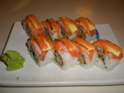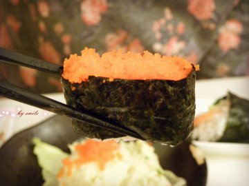 点评团团购的一份寿司:仅售18元,价值38元经典寿司火舞巴萨,奶香缭绕的火烤芝士配合新鲜美味的三文鱼,带您进入全新味觉体验! 这家店位于虹口龙之梦的B2,还蛮不好找的地方。店面橘黄色为主色调,看着就很明亮动人!去的时候一两点了,人不多,因为是现做的,所以还是等了一小会儿!上来看看就赞啊!红彤彤的的鱼子,上面铺的是烤过的三文鱼和芝士,还有甜滋滋的酱料,里面是黄瓜等一些蔬菜包在里面,味道很是小清新的感觉。一份八个,吃下去还是满饱的,店里还有免费的茶水供应,不错啊!…查看更多