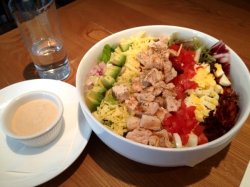 新元素 经典考伯色拉88元,个人感觉这个是菜单上面摆盘最美的一款色拉了,东西也最丰富,底部铺了生菜,一排鸡蛋粒,一拍小番茄粒,一排烤肉粒,一排牛油果粒,很均匀的量,都有的,比较大分量的,口感很好,放了柠檬汁和橄榄油,吃起来没有一点油腻感觉。