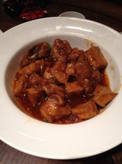 海瓜子在这里不是常见的炒,而是做的很精致的样子。绿色的豆泥,显得绸绸的,海瓜子漂浮着一层,看起来就好象在浮萍上。海瓜子已经去了壳,做的比较干净,吃到嘴里没什么泥沙了。吃起来也方便了。豆泥里混合着一些奶香味,入口细腻、滑滑的。鲜美味混合着清爽口感,很特别的一道菜。