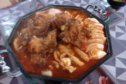 团购去的,说是原价68的韩国地鸡火锅,团购29.9,反正离公司近,本来打算团了3个女同事一起去当中饭吃掉的,结果一拖再拖……拖了之后其实就没什么欲望了……对待团购我总是这样,几乎过期才去……貌似我这人有拖延症,不仅是对团购,对什么事情都这样……团购最后一天刚好一个同学到新街口办事,于是最后变成两男一女去吃……店在淘淘巷六楼,要先电梯再转爬楼……环境很一般,半开放式的店面,比较冷清等了半个小时才上来的地鸡火锅,分量还可以冻豆腐、金针菇白菜、香菇还有魔芋结以及四大块鸡肉,我挑了一块最小的,鸡肉是煎制过后再放到火锅里炖的,能吃到明显的焦香,还不错总得来说,如果这顿饭吃到这里,29.9对于上班族,人均十元,荤素都有,**价比还是可以的,除了偏咸了点外不难吃,可惜这家店原价偏高,朋友带了个男人过来显然就不够吃咯~额外加了其他东西炒年糕,9块,盘子比较小,只比手掌稍大的长盘子,他们家的盘子碗啊什么的都比较小,炒年糕没啥技术含量,想难吃不容易~豆腐汤18,里面有蛋花、白菜和豆腐烤五花肉,差不多10片出头的样子,22米,烤好直接端上来的配的生菜黄瓜丝和蘸酱感觉这样一家没环境可言,口味也一般般的店定价偏高了,现在去大部分韩国烤肉店都有特价肉吧,韩林、釜山、汉江、韩山城、庆善园…,8-20的价格比比皆是,分量也比这个大,难怪这家店一直在做团购,估计也就只能做团购了……