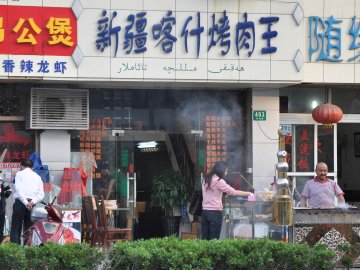 昨天晚上4个大人2个小孩去吃的,吃了350元,他们家羊肉到是绝对正宗的,羊肉味超级重,一进店里就能闻到的!烤的东西都在外面烤的,真的是大碗喝酒大口吃肉!他们家正宗到只提供茶,连饮料和酒都不提供,不过可以到对面小店里去买!点了羊肉串,羊里脊,羊排和大盘鸡,凉拌豆腐,拌三丝!还是喜欢羊肉串,羊里脊,羊排,真的非常香,而且块块是羊肉,美味啊!个人觉得羊里脊最好吃,有肉有骨头,啃起来挺过瘾的!大盘鸡的鸡到是不错,但是量不多,连面也忘了送,凉菜也就一般了!服务有些混乱,环境虽然有民族特色,但是空调不足,好热!主要就是味道正宗好吃,别的也就忽略吧! …查看更多