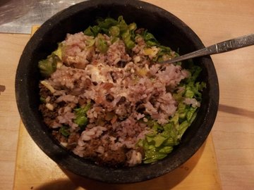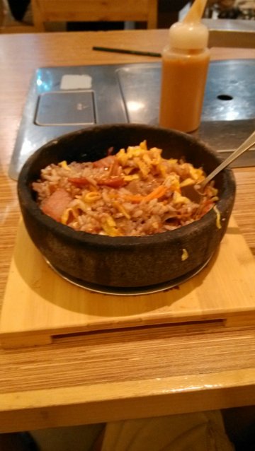一开始挺喜欢这家店的烤肉,除了团购也挺高兴,没想到限制条件很多啊,只能周一到周五中午用,还得提前预约,不大气啊~~这家烤肉挺好吃的,但是小贵,肉都是提前腌制的,用生菜卷上,味道很清爽,也嫩感受到肉的鲜美,蘸料都很简单,烤完肉之后,可以顺道烤蘑菇,味道特别好,可以粘上肉汁的香味他们家的石锅拌饭也很喜欢,一大碗挺多的,两个人吃都可以芝士石锅拌饭,味道很好,底下的锅巴特别好吃,不过芝士稍微有一些腻腻的感觉,蔬菜的量比较少,到最后都剩白饭了~~