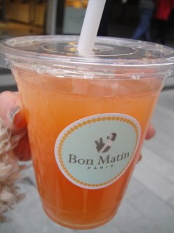 在吴江路上闲逛的时候,感觉好口渴。就随便进了一家店,过后我才知道,这里就是上海很有名的面包饮品连锁店——早安巴黎。点了一杯冰果汁,具体的名字忘记了,大概12米左右,淡淡的甜味刚好和我的心意,颜色也着实漂亮,可惜冰块加的有点多啊,4月初的上海街头喝着这样的冷饮不一会就感觉凉透了。特别喜欢早安巴黎这个LOGO设计,很不俗又高级的感觉,希望早点开到北京来。查看更多