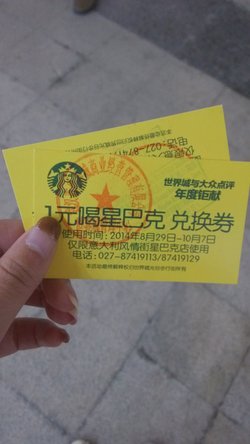 世界城做活动,1元秒杀的,密斯朵咖啡,口感还可以,环境也比较安逸。星巴克整体比较小资的感觉,不便宜,但是逛街至于能这样安静的坐着喝杯咖啡也不错。在夜色中欣赏着繁华的夜景,看着热闹的男男女女,很舒适的感觉