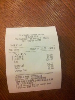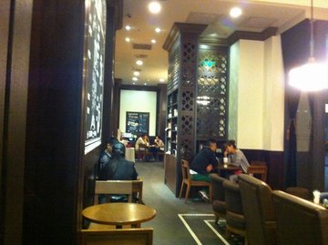 口味和其他店没什么区别,但这次去时正赶上制冰机坏了,所有星冰乐都做不了,大热天的只能喝热咖啡。朋友要了一杯白牡丹茶,喝过咖啡之后在喝白牡丹茶,觉得特别的苦!或许也正是制冰机坏了这个原因吧,所以店里人略少,大堂没有以前的满当,室内空了很多张桌子。这里的服务还不错,有个小朋友独自一人不知道从哪跑进来要冰水喝,服务员手里在忙,孩子玩的很渴,一遍一遍地重复着,那男服务员也没不耐烦,依旧很温柔的说制冰机坏了,没有冰。最后给了小朋友一杯水,小朋友喝了两口就把杯子扔别的桌子上跑了!