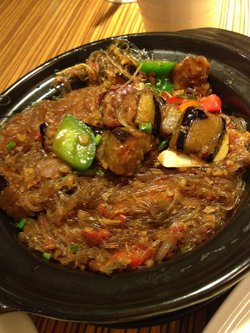 这道茄子粉丝煲味道还蛮不错的,粉丝在里面一点也没有泡发了糊掉,还是很有嚼劲很有韧性,吃起来很劲道,茄子软而不烂,在里面整个都是红红的酱油色,不过,味道不咸,鲜鲜的。查看更多