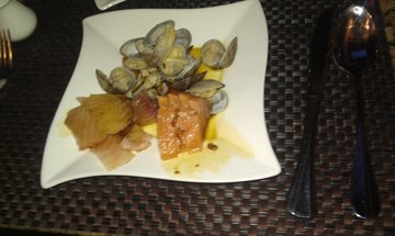 新侨饭店春晓西餐主要是西餐,中餐很少,仅有一点面条很涮锅,菜也不是以肉类为主,三文鱼不错,肉质很嫩,海鲜酱不错,蘸着酱很好吃啊,海螺也不错,很新鲜,价格有点贵奥。
