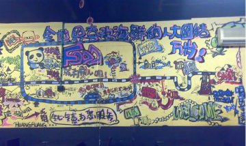 晃晃海鲜馆地方虽然不大,但其海鲜做得还是非常有特色的。无论是炒还是炸,晃晃餐厅的海鲜味道都是不错,手艺绝对可以赞一下。 黄色墙壁上涂满了各色文字和图案,很多食客吃完饭后都会在墙上涂鸦或是留下些什么,彰显餐厅热情张扬的氛围。 这是晃晃餐厅的门脸儿。地方是在胡同的拐角处,略微显得低调。不仔细看的话,很容易就错过了这家以海鲜为特色的餐厅。 餐厅惟一的一个包间。里面装修简单,却也十分干净整齐,不大的面积只要充分利用,加上高质量的美食,亦能吸引大量的食客光临。 他家的墙壁颜色十分的鲜艳,各种图案和文字印在墙壁上,彰显个性。在这里用餐,不但有一种新鲜感,还会有一股好心情,因为只要你想,你就可以自己时时进行个人创意。 美食篇 辣炒蛏子:我非常喜爱的美食之一。只要一提到蛏子,必然是大吃特吃。晃晃的蛏子味道真是不错,这是出乎我意料的,毕竟在后海这边能有这样一家小店能做出如此鲜美味道实在是不易。味道辣且咸鲜,肉质鲜美,有嚼头,余香绕舌,回味极香。 他家的海鲜还真不贵,这盘蛏子量不少,也才20来块钱。在这寸土寸金的地方,他家的价格算是很便宜了。 扇贝:每个盘子上6个扇贝,个头虽小些,味道却是不错得很。用蒜蓉做出来的扇贝味道总是那么的鲜美,虽然蒜香很浓,但蒜本身特有的强烈辣味素却不会很明显,至少不会让你在吃之前有任何的顾忌。建议到这里就餐,一定要尝一尝他家的扇贝,着实不错。 墨鱼仔:用桶装的墨鱼看上去就特有食欲。个头大大的墨鱼浇上浓汁,看着就容易忍不住夹上一块儿尝尝。味道咸鲜,肉质鲜嫩且富有弹性。个人觉得如果酱汁能拌成酸甜口的话可能会更好些。 富贵黄金虾:名字好听,菜如其名。蘸过糊的鲜虾经过滑油之后变得外松里嫩,虾的鲜味儿一点不受损失;再配上咸甜口的玉米,可以说咸鲜甜的味道都有了,丰富了口感,舒畅了心情,大力推荐这道菜。 总体而言,晃晃海鲜馆的菜做得还是可圈可点的。菜品味道好,价格也比较合理是其最大的优势。在餐厅里就餐可以随意涂鸦,抒发心情,亦是很好的创意。