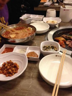 权金城的韩式料理一直挺传统的,反正价格也不贵,所以还是时不时去吃吃的。凉面是除了烤肉以外吃的最多的了,他们这里的凉面分量非常的足,我觉得一份话如果一个人吃都能吃饱了,面条挺柔韧的,感觉质感像是加了虾子的竹升面一样,但是比竹升面还要来的更加的有嚼劲,汤头凉凉鲜鲜的,里面加了不少的碎料,主要是一些青瓜丝和肉丝。西葫芦摊蛋饼是本地化改良的,西葫芦切的很小,显得挺脆爽的,水分也不少,鸡蛋的味道挺鲜的,吃起来觉得清清淡淡的。