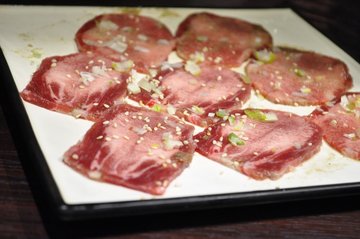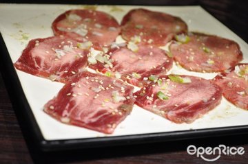 不大的店面,布置得较为简洁。灰色的地板砖,深色桌子,红色椅子。墙上和隔断的架子上装饰着酒瓶。每个桌子上都吊下来二到三个细的烟筒,吸油烟效果不错。烤肉用的是炭火炉,会及时更换烤盘。烤的品种不少,晚上有二到四人套餐可以选择。看肉质都很新鲜,量也很足。配有柠檬汁和烤肉酱两种酱汁。隔膜肉切得较薄,很嫩很滑。精选牛舌很有弹性,味道很鲜香。五花肉肥而不腻,烤得滋滋冒油,包在生菜里很好吃。泡菜酸辣开胃。总体感觉不错,价格也不贵,喜欢肉肉的可以吃个很尽兴。