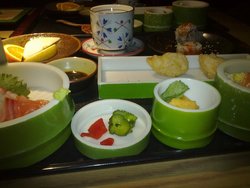 打从退出了加微信套餐折价卖活动就一直想去,那天屈臣氏换积分的时候顺便过去试了一下,果真是48元减20元,便当套餐28元搞定,小菜、蛋羹、刺身、汤品、水果、盖饭一个都不少,还有荞麦冷面赠送,总的来说说还挺划算的,同事觉得有点撑,但是我觉得种类虽多可是遇上我这种胃口大的好像就稍显不足了,小菜一小盅,刺身三片、水果三片,也就味增汤、蛋羹和青椒肉丝盖饭我吃到的还算正常量,其他就真的有点不够吃了,对了,米饭有点太硬了,不是很热,不过都28块钱了也就要求不高了。那个送的荞麦面蛮劲道的,但是蘸汁调的很一般,不是很好吃。查看更多