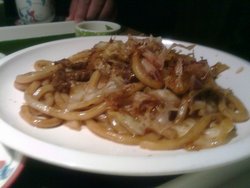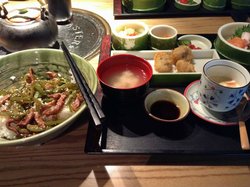 前几个月团购了2份价值38元的松本楼的单人午餐,觉得还是挺便宜的,内容也很丰富,跟老爸一起去了。这家店在丰联广场里面,坐车75、650、110等等车到朝阳门外下车,往南走可以从过街天桥穿到商场里面,这家店在2层。店面稍微有些暗,不过很干净。服务员态度都很不错,后来老爸套餐有份刺身没上来,说了一下,服务员看了一下立马就给送来了,而且规定里面是没有红金枪鱼的,可是服务员很好给了三块的刺身里面有红金枪鱼,这个很贵的。我们坐下出示了团购,主食选了牛小排炒饭和炒乌冬面的,具体叫什么乌冬面忘记了,好像28块钱那种也有,但是我是38的。上的挺快,那天人挺多,上的都很快,这个是工作午餐嘛,提前备好吧。内容很丰富。有荞麦面、刺身、鱿鱼天妇罗、大酱汤、鸡蛋羹、小菜、沙拉、寿司,还有主食,当然老爸是有荞麦面的,我是有寿司的。食材都很新鲜,刺身切的很大块,口感非常好,我记得是三文鱼、加吉鱼和章鱼,后来老爸少给的后来补的是红金枪鱼、章鱼和加吉鱼,口感都很赞。鸡蛋羹软嫩嫩的,很不错,里面有蟹棒什么的。天妇罗3块儿,块儿不太大,很酥脆,旁边有酱油蘸着吃,很不错,还有椒盐可以蘸着。沙拉很清爽,不多,一小碗,里面是生菜什么的。小菜有泡菜和酱黄瓜好像是。老爸荞麦面我也吃了,还不错,放在旁边给的是碗吗还是什么来着里面吃,里面有料汁,面条很劲道。寿司就一份,2块儿,我们俩一人一块,上面是鱼子,还有沙拉酱很不错哦,个头很大。大酱汤,热乎乎的大酱汤很好喝,里面有海带、豆腐什么的。最后来了主食,我的乌冬面不错,里面还有肉丝,肉丝很嫩,肉不少,乌冬面很劲道,有韧性,不错。老爸的牛小排也很好,就是忘记说不要辣的了,服务员也是非说不太辣,结果。。。超级辣,是用红油炒的,虽然辣但是也蛮香的。牛小排很嫩,块儿还算比较大,我们俩分了,挺香的、挺厚的。查看更多