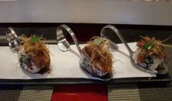 长草很久的店家,这么火居然从来没有去吃过,放假就去吃了。他家在南京西路上,但是不太好找。来回走了几趟才找到的。店挺小,布置的不错。菜单内容还挺多的,我选了什锦散寿司+甜虾寿司。朋友的招牌牛油果金枪鱼寿司和烟熏鸭胸鹅肝卷。什锦散寿司,上面鱼生还是很多的,不过切的比较小,牛油果和三文鱼子也挺多,量挺大的,和朋友share下正好。甜虾寿司,很新鲜,肉质晶莹,甜甜的。牛油果金枪鱼寿司,牛油果太硬了...散寿司里的比较好。烟熏鸭胸鹅肝卷,勺子好看!= =尝试了下,勉强可以一口进去...味道不错。因为都有饭,所以一顿吃下来很饱!…查看更多