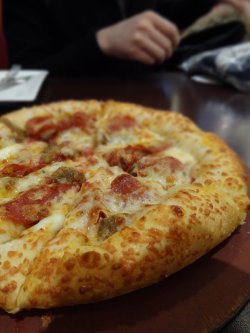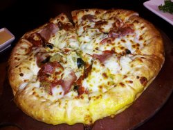 披萨味道还是不错的,经常是必胜客和这家店换着吃的~有外卖的,蛮方便的说~喜欢荤食天地,披萨上面的料还是蛮多的,12寸的,芝士很多,拉丝效果很好的,肉是指的培根,香肠什么的,还蛮好味道的~芝士条好吃的,小号的披萨,底蛮脆的,吃口很不错~查看更多