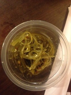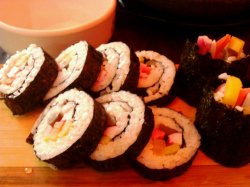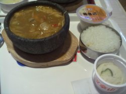 选的是大酱汤套餐:大酱汤+辣白菜(小盒)+米饭。这里的大酱汤里面是五花肉,不像汉拿山里放的是虾仁。大酱汤端上来,颜色很淡,让人看上去没有什么太大的味口,但味道还可以。米饭:不怎么样,一点儿也不香。紫菜包饭还可以,就是蘸料不酸不甜的,不太合我的口味查看更多