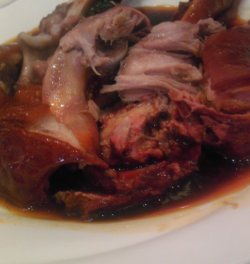 说是创意湖北菜,其实比较杂,说不上来到底是什么菜式的。环境装修方面都挺不错的,大气富丽堂皇,空间够大,很是适合婚宴。果木碳烤乳鸭,鸭子个头确实不大,鸭脖子都烤的皮掉了,上来的时候没有片好,可以当场给片,也可以自己撕着吃。总体来说挺外焦里嫩的,比较香。番茄煮活鱼,第一次吃这样的做法,番茄在汤里泡久了就不太好看,汤汁倒是有点番茄的甜酸香味,鱼肉不是很嫩,一般,我不是很喜欢吃,我觉得鱼肉还是要辣一点才够去腥消腻。青椒牛蛙,牛蛙剁得比较小,很容易入味,加上青椒的鲜辣椒味,还有花椒,挺好吃的。主食我们点的黄米饼,有点像烙的大饼,里面比较蓬松,外面稍微有点焦香,还不错。…查看更多