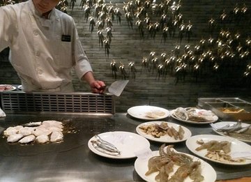 这次来吃它家的铁板自助,喜欢它家厨师的花样铁板,它家的三文鱼挺正宗的,听说还是国外进口的,吃起来到是没吃出什么就是味道比较鲜,肉质嫩一点,白虾挺好吃的,肉质比较嫩,吃起来有一点甜的味道,挺好吃的。